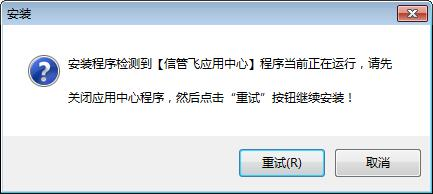 ????(2)如果運行安裝程序后提示如下信息,則表示您正在運行客戶端程序,先退出程序,然后點“重試”按鈕即可繼續安裝。