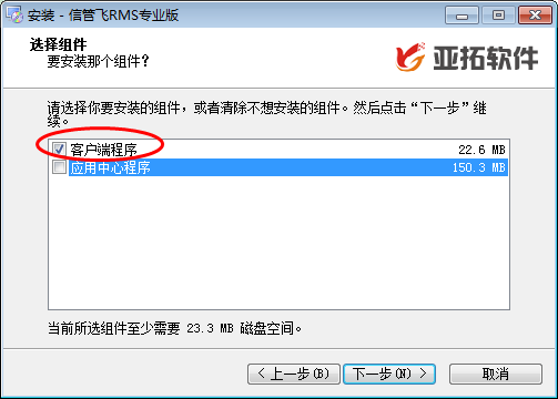 ????點“下一步”按鈕進入選擇安裝組件界面,如果購買的是網絡版,在客戶端電腦上(非主機電腦),只需要打勾選擇安裝“客戶端程序”,不需要安裝“應用中心程序”。