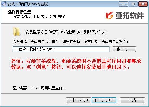 ????(2)默認安裝程序會安裝到 D:\信管飛軟件 目錄下,您也可以選擇其他目錄,但我們建議不要安裝到操作系統所在的磁盤(一般是C盤)。