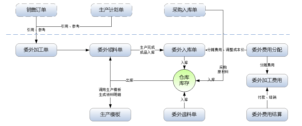 ????實際的企業(yè)生產(chǎn)業(yè)務(wù)中經(jīng)常會涉及委外代加工業(yè)務(wù),有時候需要委托外部工廠幫我們生產(chǎn)一些配件,有時候需要幫忙生成半成品,然后委外生產(chǎn)的成品或半成品,再進(jìn)入我們車間進(jìn)行再加工(如包裝封箱、或二次加工等)。專業(yè)版及以上版本可以購買 “委外加工管理”擴展功能模塊來管理此業(yè)務(wù)。