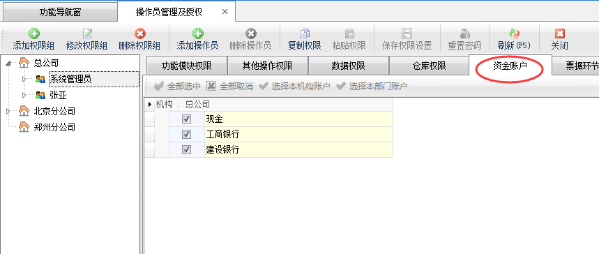 ????⑤ 倉庫權限、資金賬戶權限屬于特殊的數據權限,可根據情況給每個操作員設置可管理的倉庫和資金賬戶。
