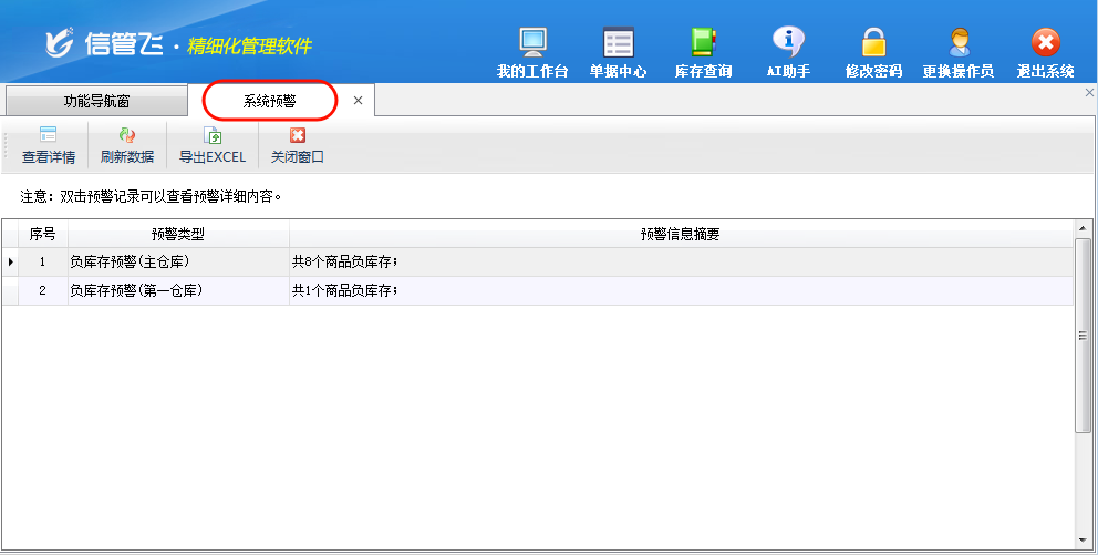 ????啟用“負庫存提示”時,如果單據明細中的商品出現負庫存,則軟件彈出如下提示窗口。如果不允許負庫存出庫,則軟件彈出審核失敗,庫存數量不足!