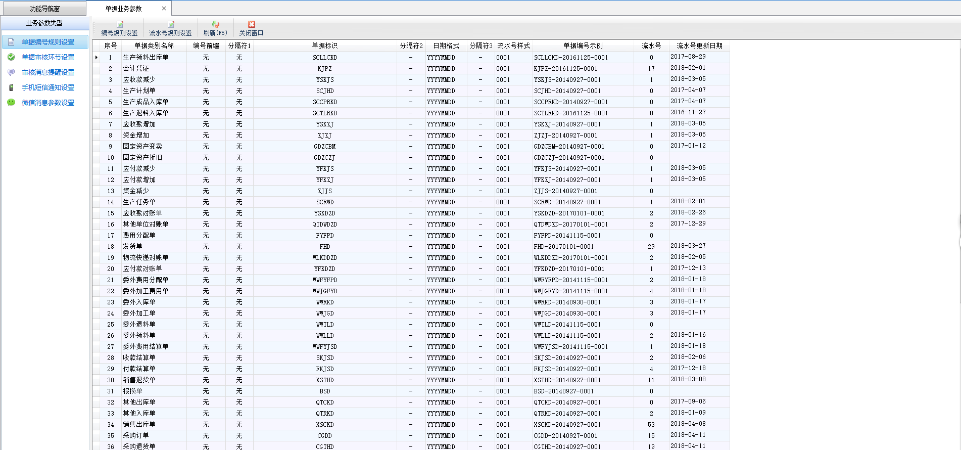 ????單據設置中可以配置單據編號規則、單據審核環節、單據消息提醒等。