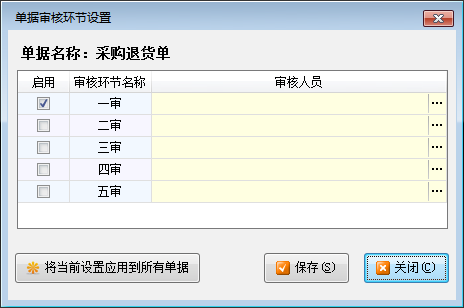 ????啟用多環節權限控制后,相應的業務單據可以設置多級審核(在“系統管理”—》“單據設置”中的單據環節設置中可維護每類單據的環節和審核人),只有最后一級審核完成后,業務單據才最終審核生效。
