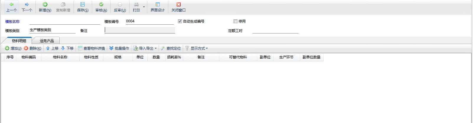 反審:點工具欄中的“反審”按鈕,可以對“已審核”的生產模板進行反審。