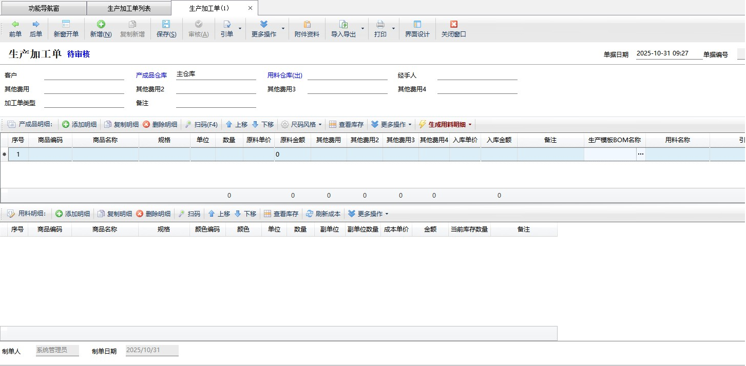 ????單據(jù)主體中產成品倉庫和用料倉庫(出)是必填項,其他皆為選填即可。該功能為簡易加工功能,沒有復雜的操作流程。