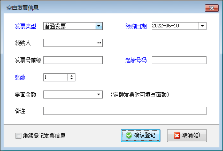 新增記錄:點(diǎn)擊“新增記錄”按鈕,進(jìn)入“空白發(fā)票信息”窗口,如下圖所示,其中“起始號(hào)碼”、“張數(shù)”是必填項(xiàng),其他內(nèi)容根據(jù)自己的業(yè)務(wù)需要進(jìn)行填寫,最后點(diǎn)擊“確認(rèn)登記”即可。