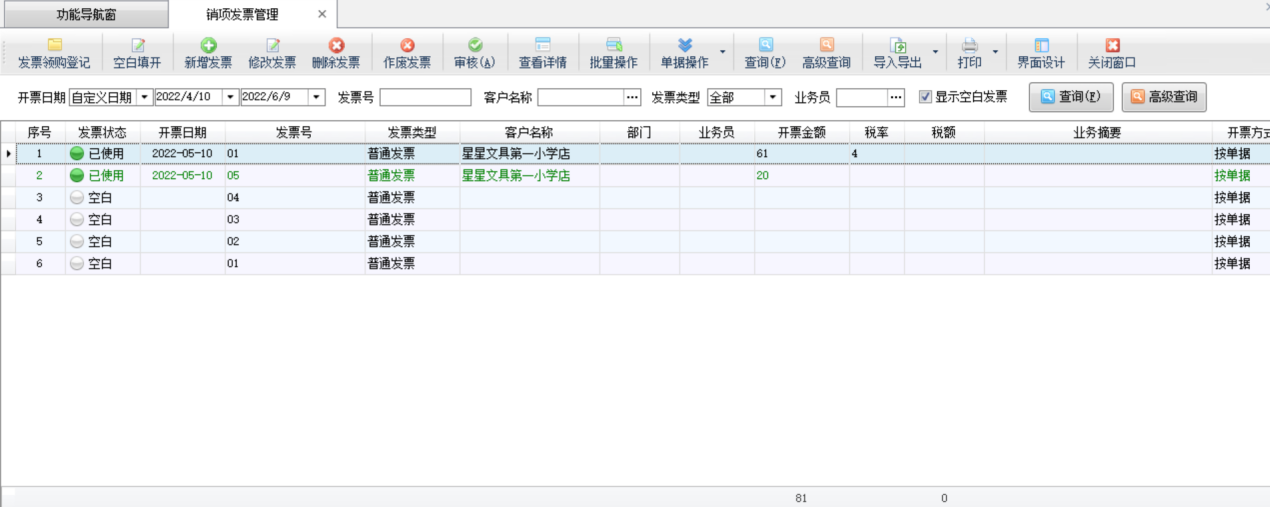 查詢:可以根據(jù)開票日期、發(fā)票號(hào)、客戶名稱、發(fā)票類型、業(yè)務(wù)員等信息查詢銷項(xiàng)發(fā)票。