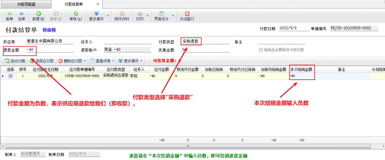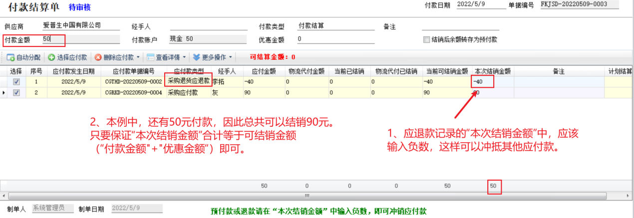 ????② 應(yīng)退款記錄的“本次結(jié)銷金額”需要輸入負(fù)數(shù),這樣可以沖抵其他應(yīng)付款記錄(正負(fù)可以抵銷)。使用應(yīng)退款沖銷應(yīng)付款,可以不錄入本次付款金額(即沒有新付款),這樣可沖抵的金額即為應(yīng)退款的金額。