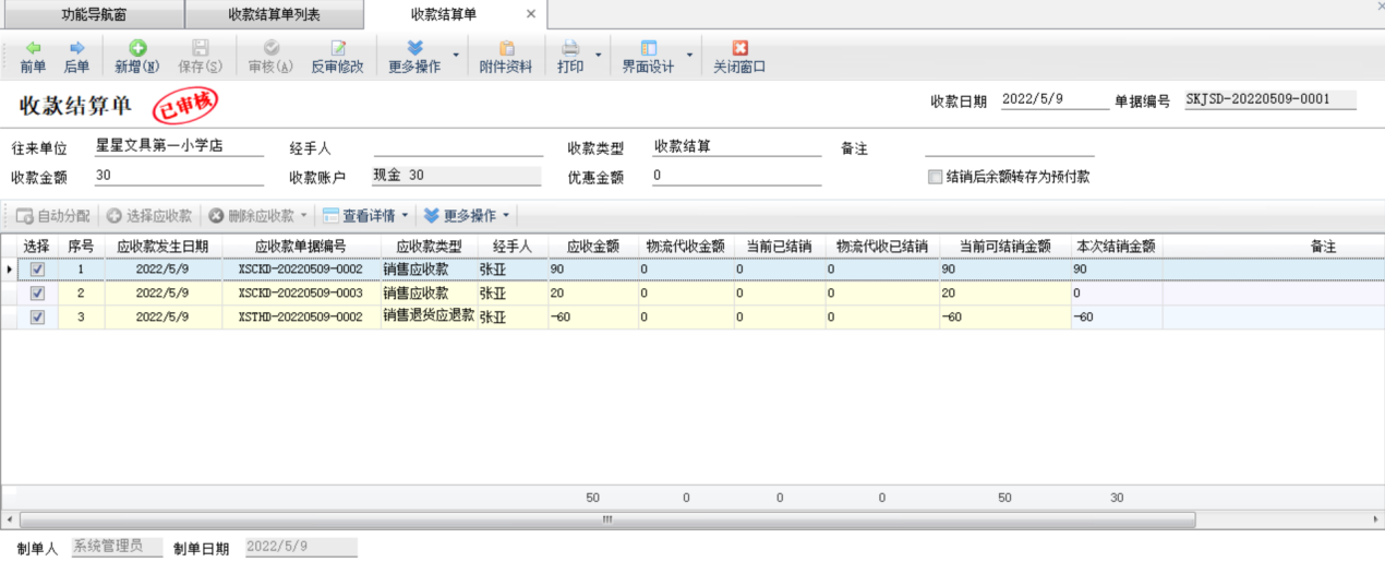 批量操作:點(diǎn)擊“批量操作”按鈕后,進(jìn)入批量操作模式,可以打勾選擇要操作的收款結(jié)算單,然后執(zhí)行批量刪除等操作。