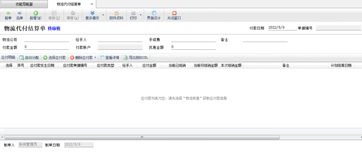 ????物流代付結(jié)算單的操作與付款結(jié)算單基本一致,這里不再詳述。