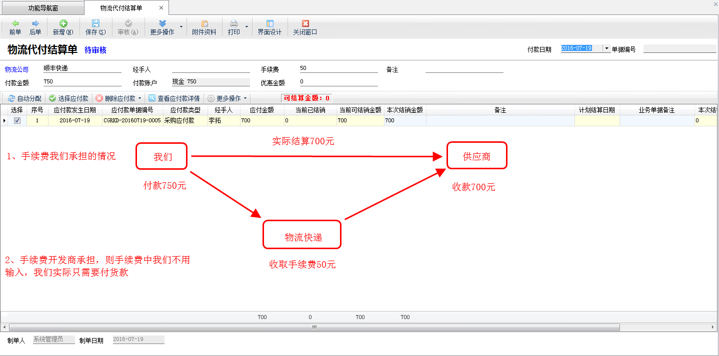 ????需要注意的是如果手續(xù)費(fèi)需要我們承擔(dān),則物流代付結(jié)算單中的可結(jié)算金額等于(付款金額 - 手續(xù)費(fèi) + 優(yōu)惠金額),也就是說物流快遞公司只會(huì)將收款金額扣除手續(xù)費(fèi)后的剩余部分金額付給供應(yīng)商,即實(shí)際我們可以跟供應(yīng)商結(jié)銷的金額是不包括手續(xù)費(fèi)的。如果手續(xù)費(fèi)由供應(yīng)商承擔(dān),手續(xù)費(fèi)輸入 0,因?yàn)榭爝f物流公司收取我們的金額,就是可用于結(jié)銷金額。下圖為一個(gè)實(shí)際的物流代付款例子: