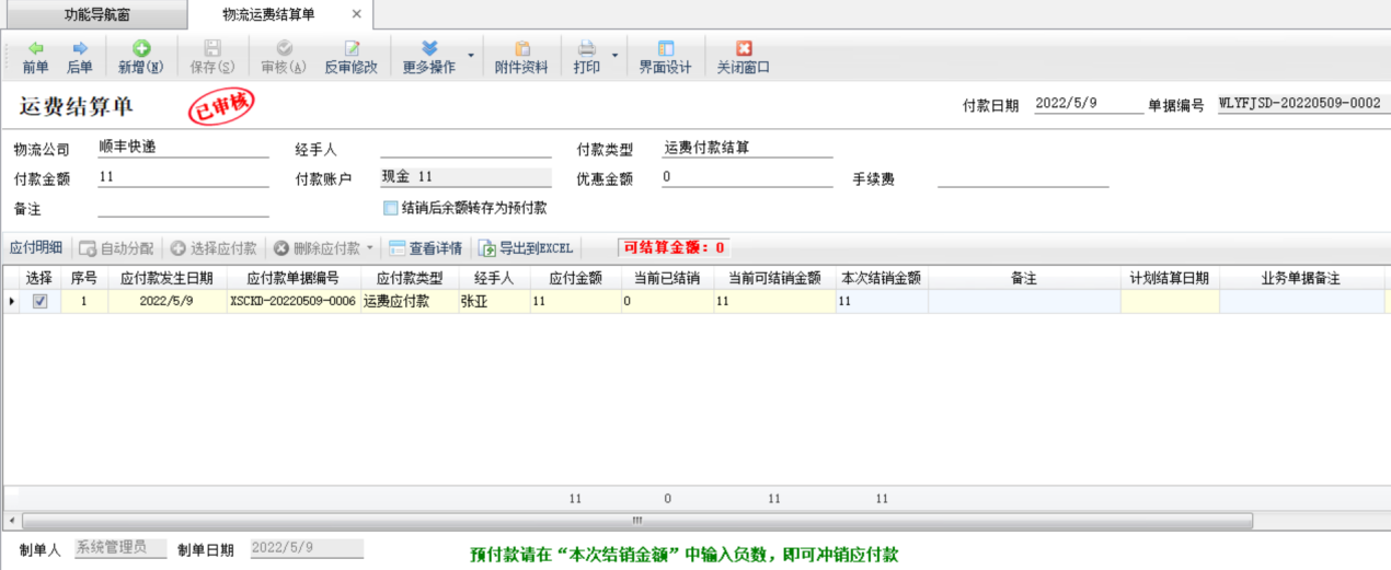 ????物流運(yùn)費(fèi)結(jié)算單的操作與付款結(jié)算單基本一致,這里不再詳述。