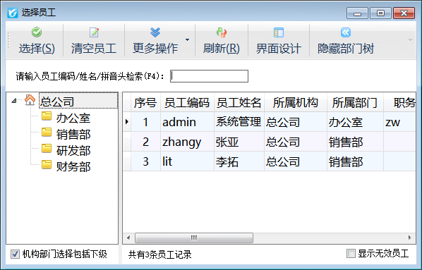 ????在選擇員工窗口,可以在輸入框中輸入人員的姓名或者拼音碼(即拼音頭)進行檢索。選擇查找到的人員,然后點擊“選擇”按鈕,或者直接雙擊記錄即可。