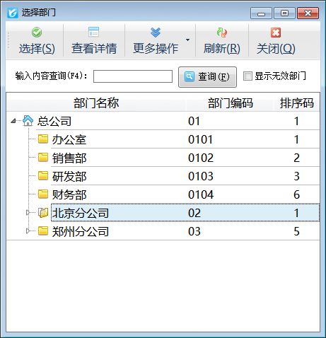 所屬部門:非必填項,選擇員工后,系統(tǒng)自動會填寫入該員工的部門。如需要修改,請點擊“選擇部門”按鈕,系統(tǒng)彈出“選擇部門”窗口,如下圖所示: