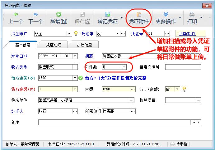 憑證附件:點擊“憑證附件”按鈕,可掃描或?qū)肱c憑證相關(guān)的電子文件。如下圖所示: