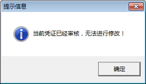????選擇一個憑證,然后點擊工具欄中的“修改憑證”按鈕,如果該憑證已審核,則系統(tǒng)不允許修改,彈出如下的提示信息: