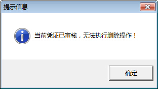 ????選擇一個憑證,然后點擊工具欄中的“刪除”按鈕,如果該憑證已審核,則系統(tǒng)不允許刪除,彈出如下的提示信息: