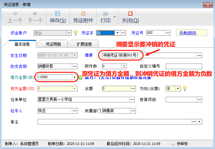 ????如果已審核的憑證確實有誤,可以點擊“更多操作”—》“紅字沖銷”按鈕,進行沖銷,詳細操作見下面的描述。