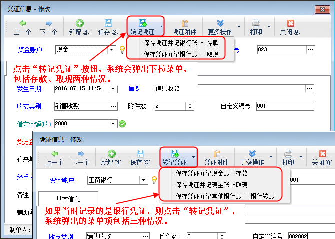 ????在新增或修改憑證時,系統(tǒng)支持“轉(zhuǎn)記憑證”功能,用于處理存款、取款、轉(zhuǎn)帳等涉及多個帳戶的憑證錄入,方便用戶操作,減少重復錄入。