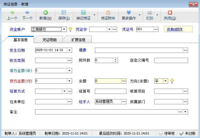 方向:保存憑證后,系統(tǒng)自動生成,不允許修改。此處指的是賬戶余額的方向,余額大于 0 為借,小于 0 方向為貸,等于 0 方向為平。
