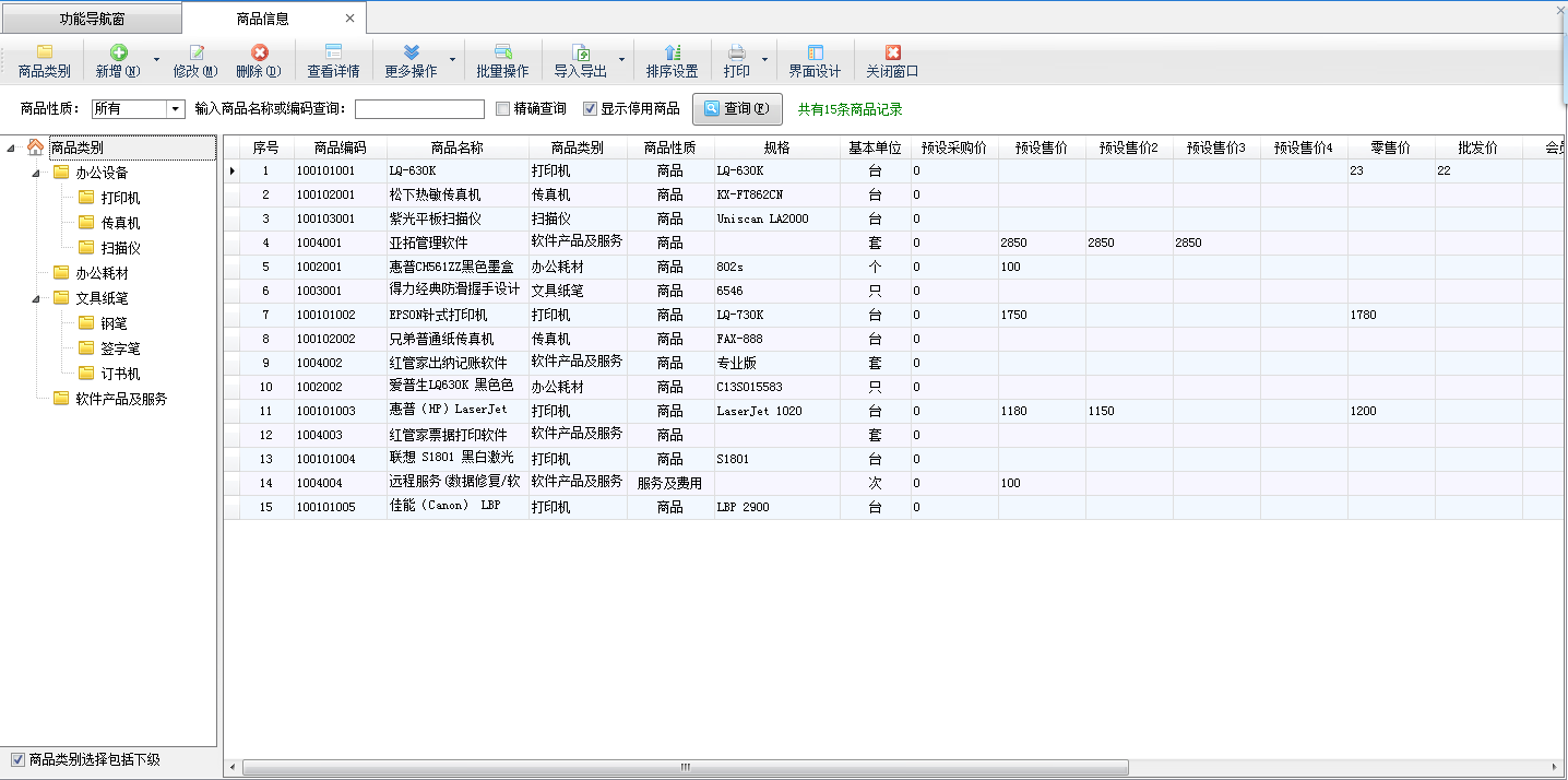 ????點“基礎資料”—》“商品信息”可以進入商品信息管理功能。點“商品類別”按鈕可以管理商品類別,點“新增”按鈕可以增加新商品,點“修改”按鈕可以修改商品信息,點“刪除”按鈕可以刪除商品。軟件只支持刪除未使用過的商品(即在業務單據中沒有使用過的),已使用過的商品,如果不再使用可以設置為“已停用”。
