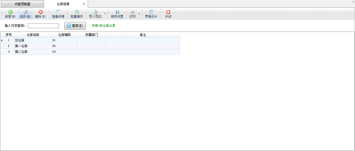 ????點“基礎資料”—》“倉庫信息”可以進入倉庫信息管理功能。點“新增”按鈕可以增加新倉庫,點“修改”按鈕可以修改倉庫信息,點“刪除”按鈕可以刪除倉庫。點“排序設置”按鈕可以對倉庫進行排序,后續在選擇倉庫和倉庫查詢中可以按照排序進行顯示。