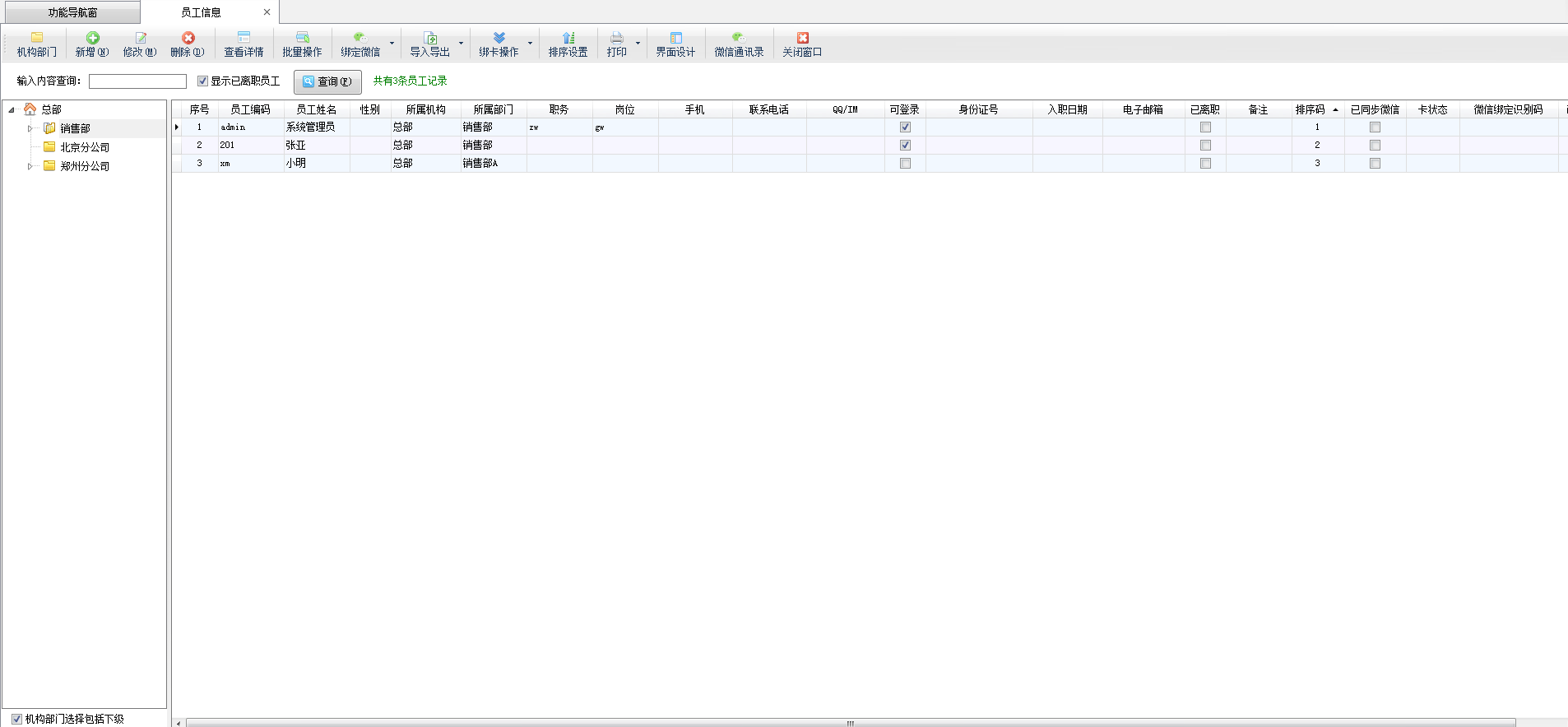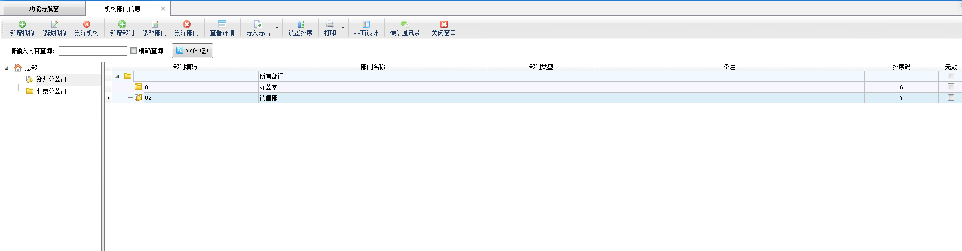 ????點“新增部門”可以增加新的部門,點“修改部門”可以修改部門信息,點“刪除部門”可以刪除部門。點“查看詳情”可以查看部門信息,查看部門信息窗口默認是只能查看,無法修改的。