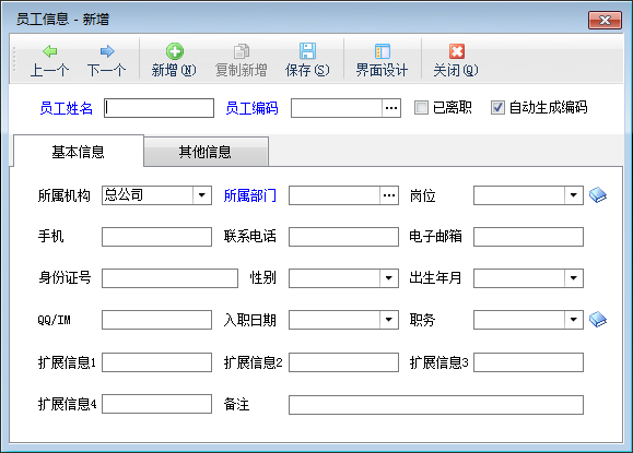 員工編碼:必填數據項,如果不填寫,則軟件會自動根據姓名的拼音頭作為編碼。