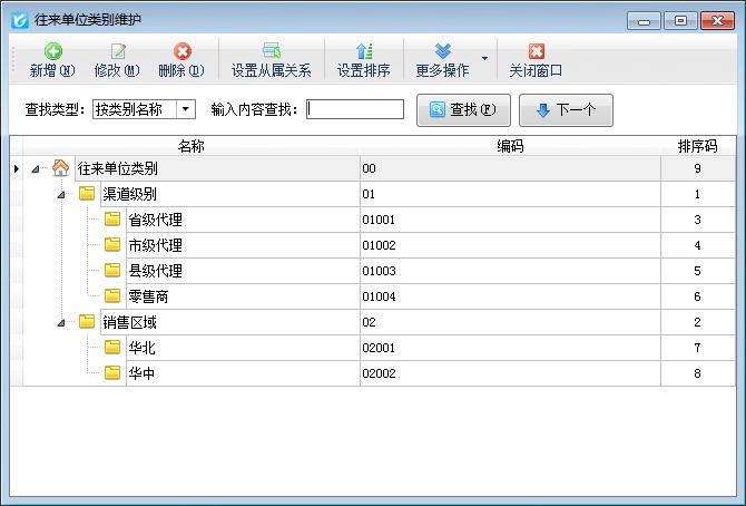 ????軟件支持無限層級的往來單位類別,并支持自動生成類別編碼,方便后續查詢和統計。點“設置從屬關系”進入拖動調整從屬關系模式,可以拖動改變類別的從屬關系。點“設置排序”可以調整類別的排序。