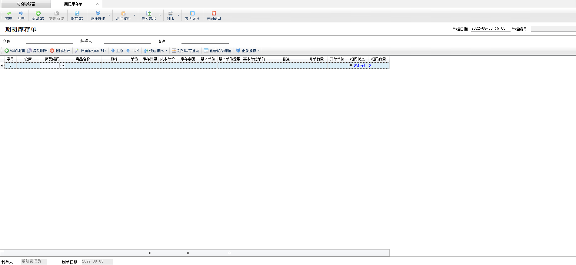 ????點“基礎資料”—》“期初建賬”,然后點“期初庫存錄入”,進入“期初庫存單”可錄入期初商品庫存。如果已開賬,則只能查看無法進行新增和修改。