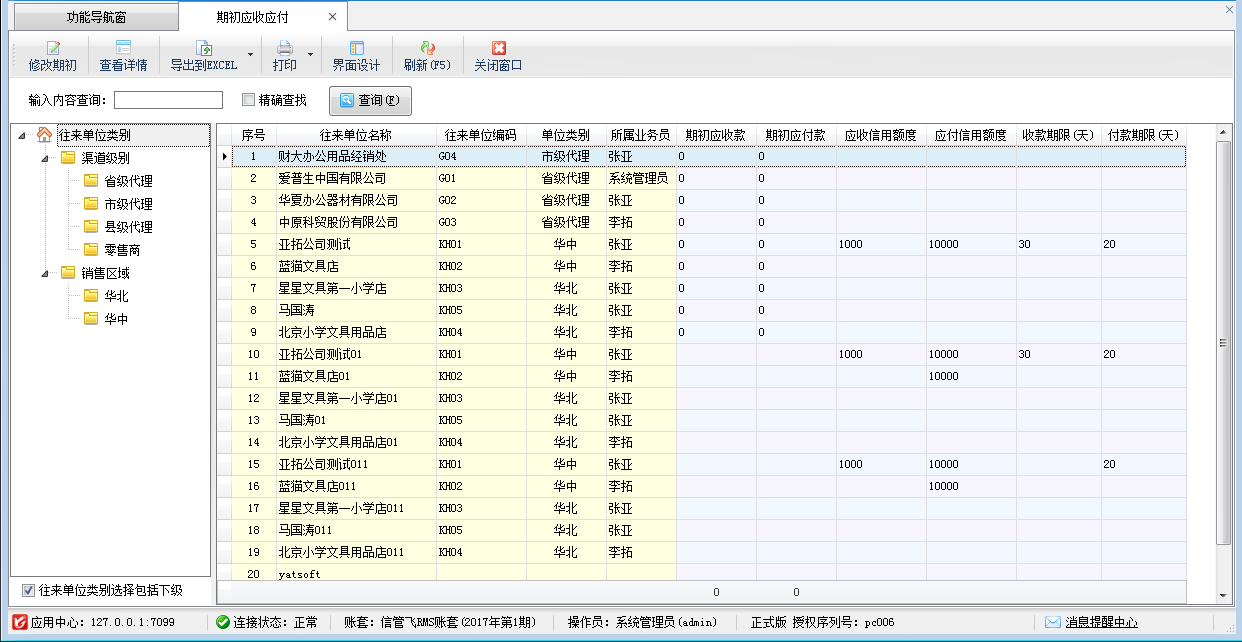 ????點“基礎資料”—》“期初建賬”,然后點“期初應收應付”功能按鈕,進入“期初應收應付”可錄入往來單位的期初應收款和應付款。期初應收應付款支持通過Excel批量導入。