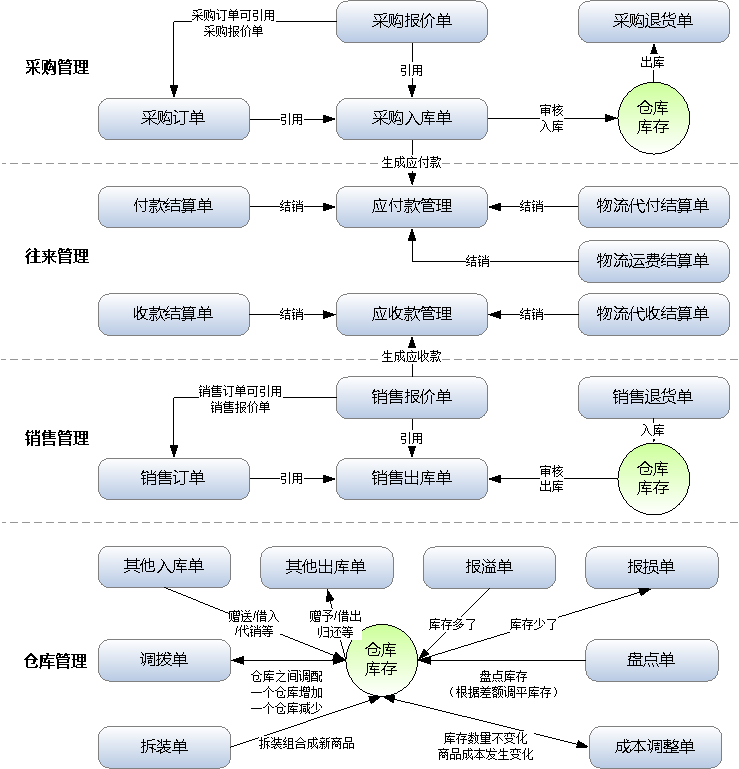 ????信管飛RMS為進銷存、財務一體化管理軟件,業務覆蓋企業經營管理的方方面面,下圖為進銷存(采購管理、銷售管理、倉庫管理、往來管理)的基本流程圖: