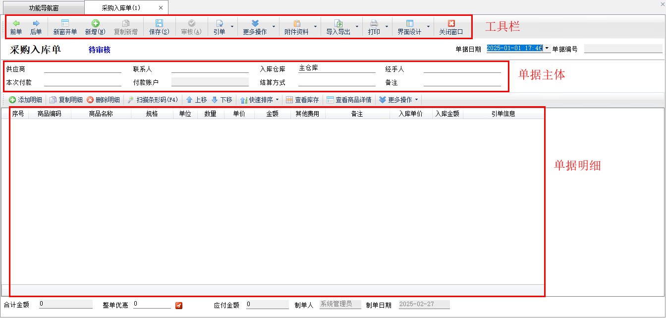 ????在功能導航中點“采購管理”—》“采購入庫單”,進入采購入庫單錄入界面,單據界面分為“工具欄”、“單據主體”、“單據明細”三部分。