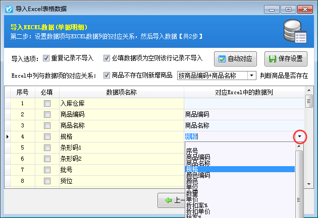????比如選擇“按商品編碼+商品名稱”,商品資料庫存中如果存在商品編碼一樣且商品名稱一樣的商品信息則不再新增加。