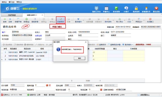 在企業數字化管理中,單據是業務流轉的核心憑證,它的準確性直接影響庫存統計、財務對賬和業務復盤的真實性、嚴謹性。尤其是在進銷存管理中,很多企業都會遇到一個難題:已經審核通過的單據,可能會被誤改、亂改,進而導致數據出錯、流程混亂。這不僅會增加財務核算的工作量,還可能給企業帶來潛在的經營風險,成為企業精細化管理的“攔路虎”。 針對這一痛點,我們新增了單據確認功能,用簡單的操作、嚴格的管控,徹底解決“已審核單據可隨意修改”的問題,為企業單據管理加上“雙重保險”,幫助企業實現更規范、更高效、更安全的數字化管