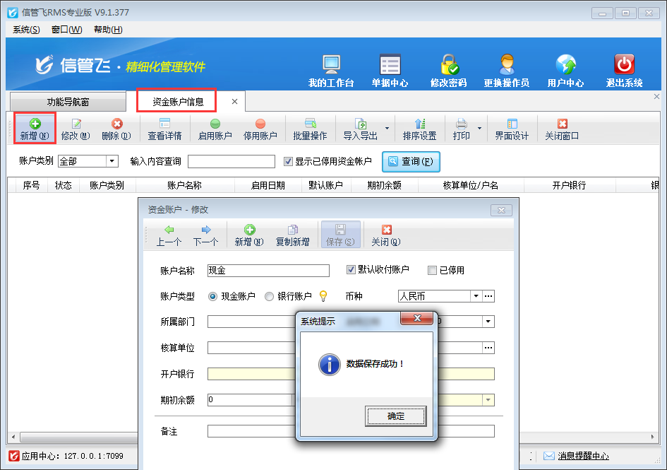 這種情況是因為在系統內沒有維護資金賬戶導致的,請在功能導航窗點擊“基礎資料”—》“資金賬戶”打開資金賬戶管理界面增加資金賬戶即可,如下圖所示。