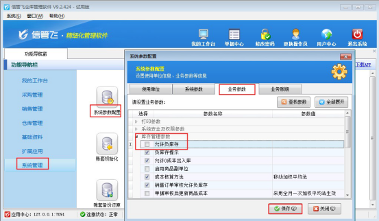 在功能導(dǎo)航窗點(diǎn)擊“系統(tǒng)管理”—》“系統(tǒng)參數(shù)配置”—》“業(yè)務(wù)參數(shù)”,進(jìn)入“業(yè)務(wù)參數(shù)”配置界面,在庫存管理參數(shù)中找到參數(shù)“允許負(fù)庫存”,取消勾選符號(hào),點(diǎn)擊“保存”,如下圖所示: