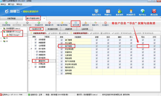 在功能導(dǎo)航窗點(diǎn)擊“系統(tǒng)管理”—》“操作員及授權(quán)”打開操作員管理及授權(quán)界面,選擇操作員“張亞”,在功能模塊權(quán)限界面,選擇“基礎(chǔ)資料”—》“客戶信息”,在導(dǎo)出權(quán)限下,把客戶信息“導(dǎo)出”權(quán)限勾選取消后保存權(quán)限,如下圖1所示: