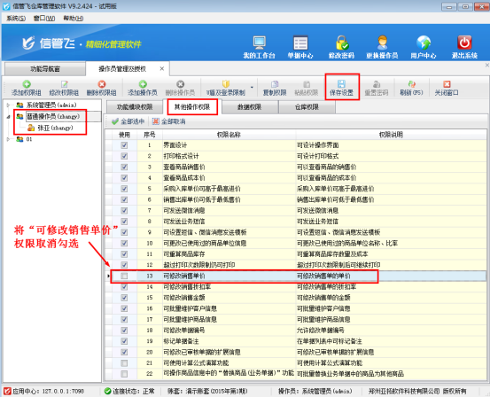 在功能導航窗選擇“系統(tǒng)管理”—》“操作員及授權”,進入操作員管理及授權界面,以操作員“張亞”為例,選擇操作員后,點擊“其他操作權限”,取消勾選“可修改銷售單價”,然后保存設置,如圖1所示。