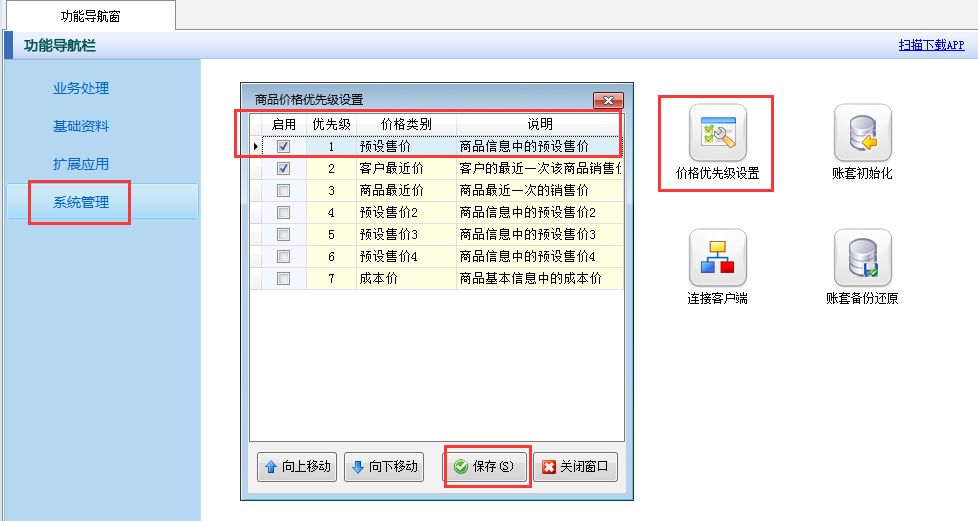 在“價格優先級設置”窗口中打勾啟用“預設售價”,并上移至第一位,然后保存設置即可。(說明:打鉤表示生效,點擊“向上移動”和“向下移動”按鈕可以調整價格的優先順序,系統按上一個價格策略沒有獲取到價格時,會自動按下一個價格策略獲取價格。)