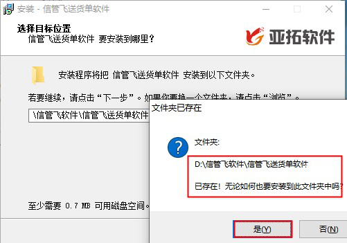 刪除后邊重復的內容,點擊下一步,會提示文件夾中已存在軟件,是否繼續安裝在此文件夾,點擊“是”表示覆蓋安裝到之前的文件夾中。如下圖所示: