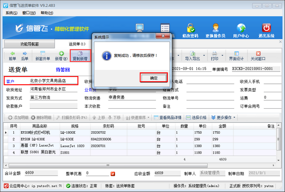 送貨單支持復(fù)制新增功能,可以選擇已確認(rèn)開單的送貨單進(jìn)行復(fù)制新增生成一個(gè)一模一樣的新單據(jù)。如下圖所示: