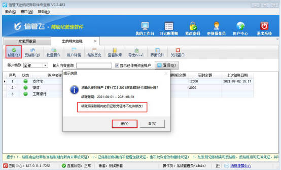 對(duì)資金賬戶“支付寶”進(jìn)行結(jié)賬處理,選擇賬戶名稱為“支付寶”的記錄,點(diǎn)擊工具欄的“結(jié)賬”按鈕,系統(tǒng)會(huì)彈出提示“結(jié)賬賬期:2021-08-01~2021-08-31,結(jié)賬后該賬期內(nèi)的憑證將不允許修改!”,點(diǎn)擊是,賬期會(huì)轉(zhuǎn)入下一賬期,如下圖所示: