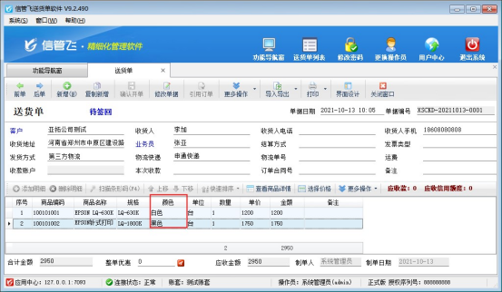 送貨單開單界面上新增加一列“顏色”,開單界面如下圖: