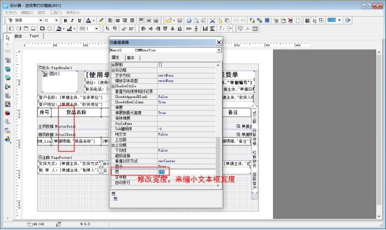 如何在打印模板上加上此列?打印模板格式因為尺寸固定,需要增加新的明細列,要先縮小其他文本框的寬度。在開單界面打印下選擇打印格式設計,打印格式設計界面點擊“設計格式”,進入模板設計器界面,選擇需要縮短寬度的文本框,鼠標左鍵單擊選擇文本框(需要多選可按著shift鍵鼠標分別單擊,可同時修改兩個文本框),下一步鼠標右鍵,選擇屬性,打開“對象查看器”找到寬度,修改寬度,enter鍵確認,然后關閉“對象查看器”可看到文本框按寬度修改,如下圖所示:
