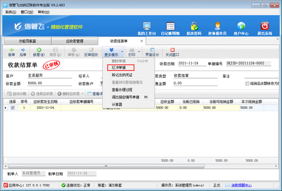 然后在收款結算單界面點擊“更多操作”—》“紅沖單據”,如下圖所示,單據紅沖后,點擊“更多操作”—》“刪除按鈕”,即可刪除收款結算單。