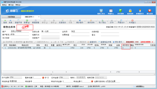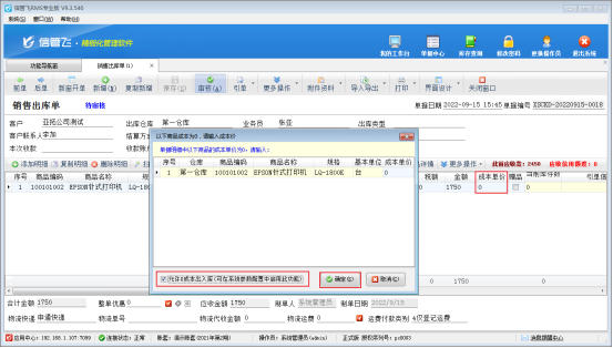 設(shè)置完成后,在功能導(dǎo)航窗點(diǎn)擊“銷售管理”—》“銷售出庫單”,新開銷售出庫單,此時(shí)如果商品的成本單價(jià)為0,審核單據(jù)時(shí)會(huì)出現(xiàn)“以下商品成本價(jià)為0,請(qǐng)輸入成本價(jià)”的提示信息,這時(shí)需要勾選左下方允許0成本出入庫,之后點(diǎn)擊“確定”,單據(jù)可審核成功,如下圖所示: