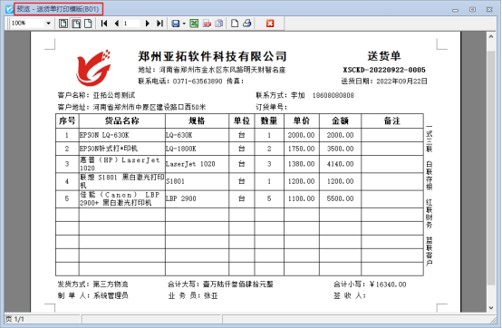 新開(kāi)送貨單并確認(rèn)開(kāi)單,在打印按鈕下選擇“打印預(yù)覽”可預(yù)覽默認(rèn)樣式,如下圖所示: