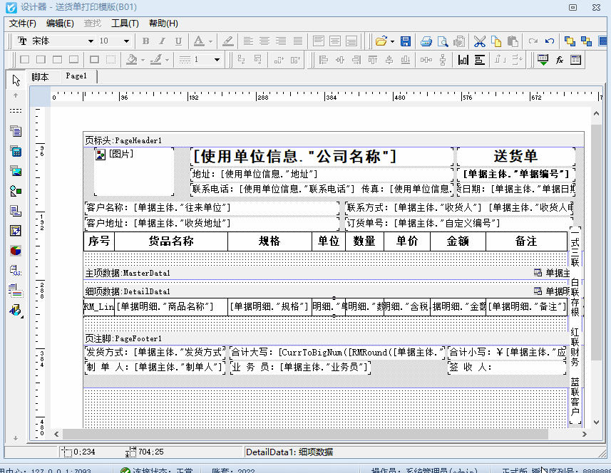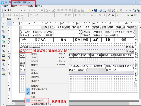 模板設(shè)計(jì)器界面。選擇細(xì)項(xiàng)數(shù)據(jù)表頭,鼠標(biāo)右鍵取消選擇“自動(dòng)增加空行”預(yù)覽會(huì)不顯示空白格,然后替換“頁(yè)注腳”為“數(shù)據(jù)注腳”(頁(yè)注腳是在每頁(yè)頁(yè)尾顯示,中間有空白行不會(huì)連接明細(xì)項(xiàng)),如下圖所示: